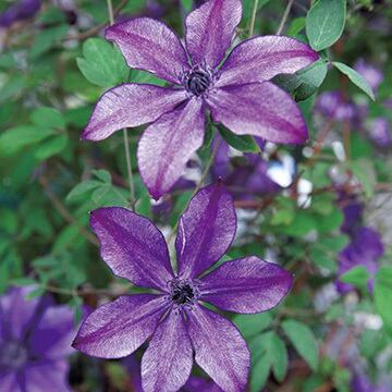 花は青みがかる紫色、マットな質感の深く渋い色合い。濃い紫色の花芯と相まって、ダークな雰囲気を醸し出します。咲き始めは全体的に紫色が強く、咲き進むと白味を帯びグラデーションが美しくなります。この色合いの変化は枝の充実や温度の関係もあり、育てる環境によって差が出ます。一見すると洋風素材との相性が良さそうですが、和風の趣もあり、色々な組み合わせにチャレンジしたくなる品種。