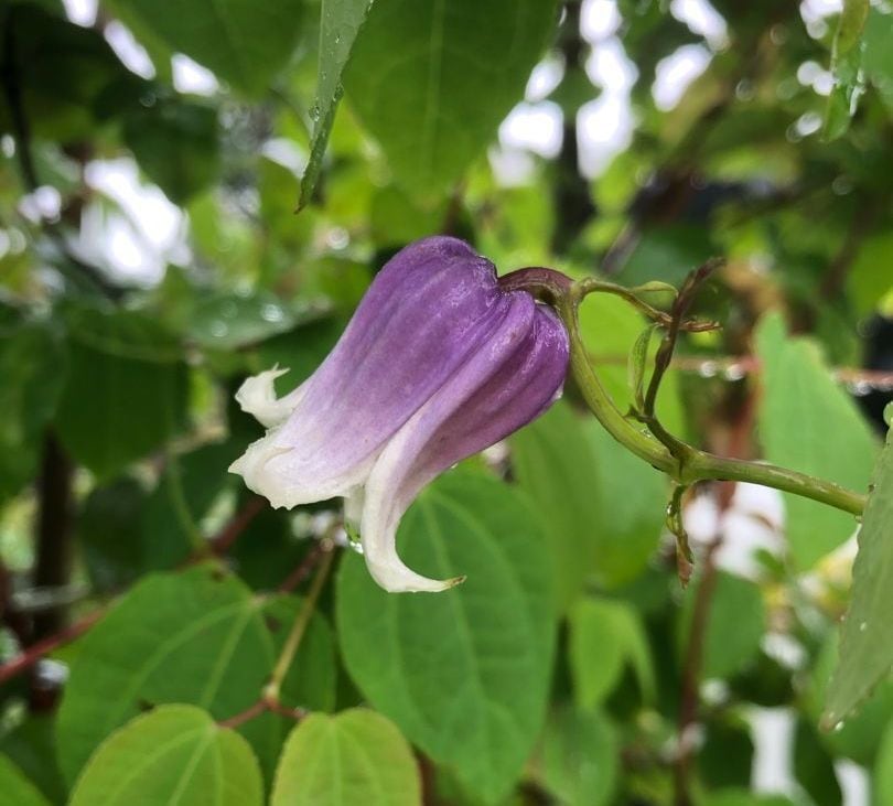 花の外側は紫色で弁先が白色、内側は白色の壷形品種です。伸びたつるの節々に花をつけます。