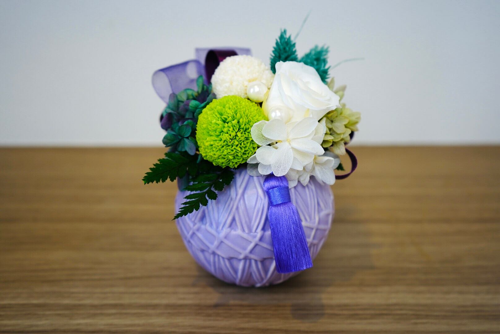 邪魔にならないサイズ感で、お仏壇や写真の傍らにそっと置いていただけるお供え花としておすすめです。
