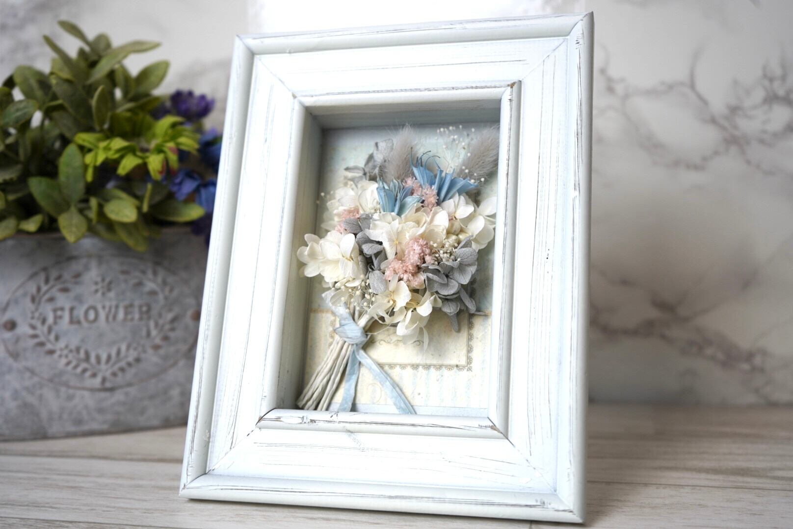 あじさいのプリザなどで作った淡い色合いのニュアンスカラー花束をフレームの中に収めた