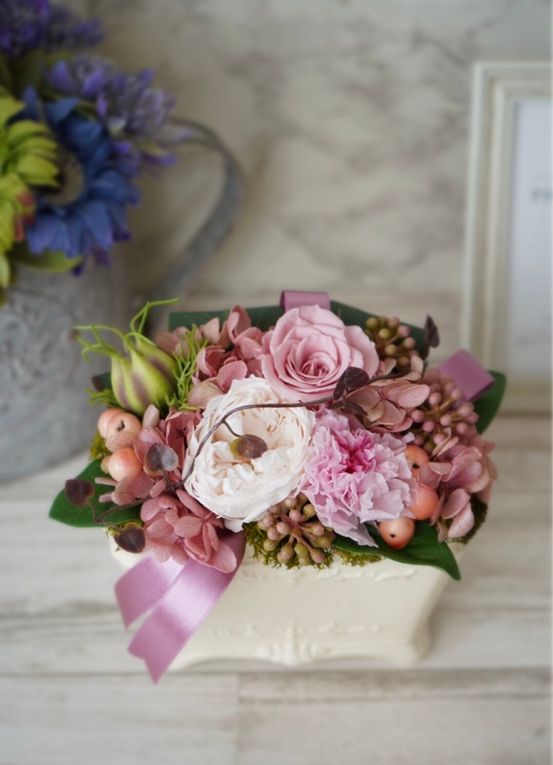 枯れないお花プリザーブドフラワーのピンクカーネーション・バラ・あじさいを組み合わせ、色々な種類の木の実が可愛らしいナチュラルアレンジ!