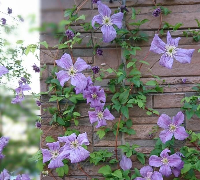 ほど良い中輪サイズのクレマチスで、花つきが抜群で、バラを引き立てるように周囲で一面に咲いてくれます。